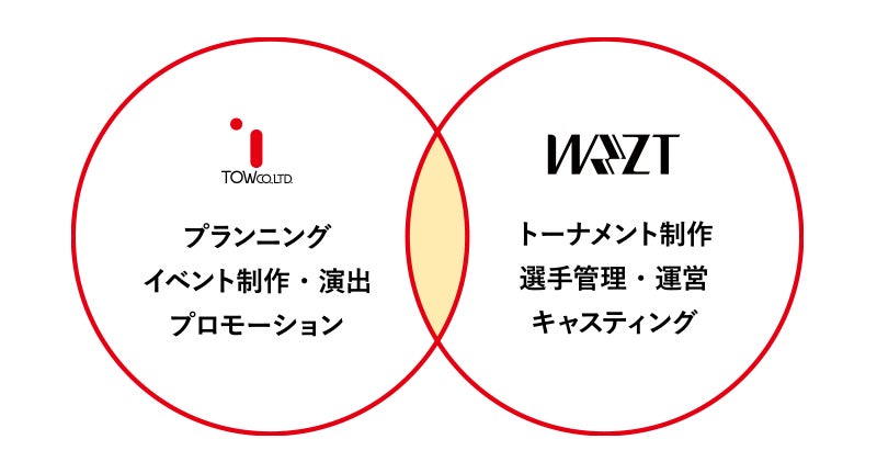 ウェルプレイド・ライゼスト社がeスポーツの総合商社として長年培ってきた大会やイベントの企画制作・運営や配信技術、許諾関係といったノウハウにTOWが多種多様な業界クライアントとともに培ったプロモーションノウハウとオン-オフを問わないイベント演出力を掛け合わせ、運営とプロモーションの両輪をワンストップで推進します。