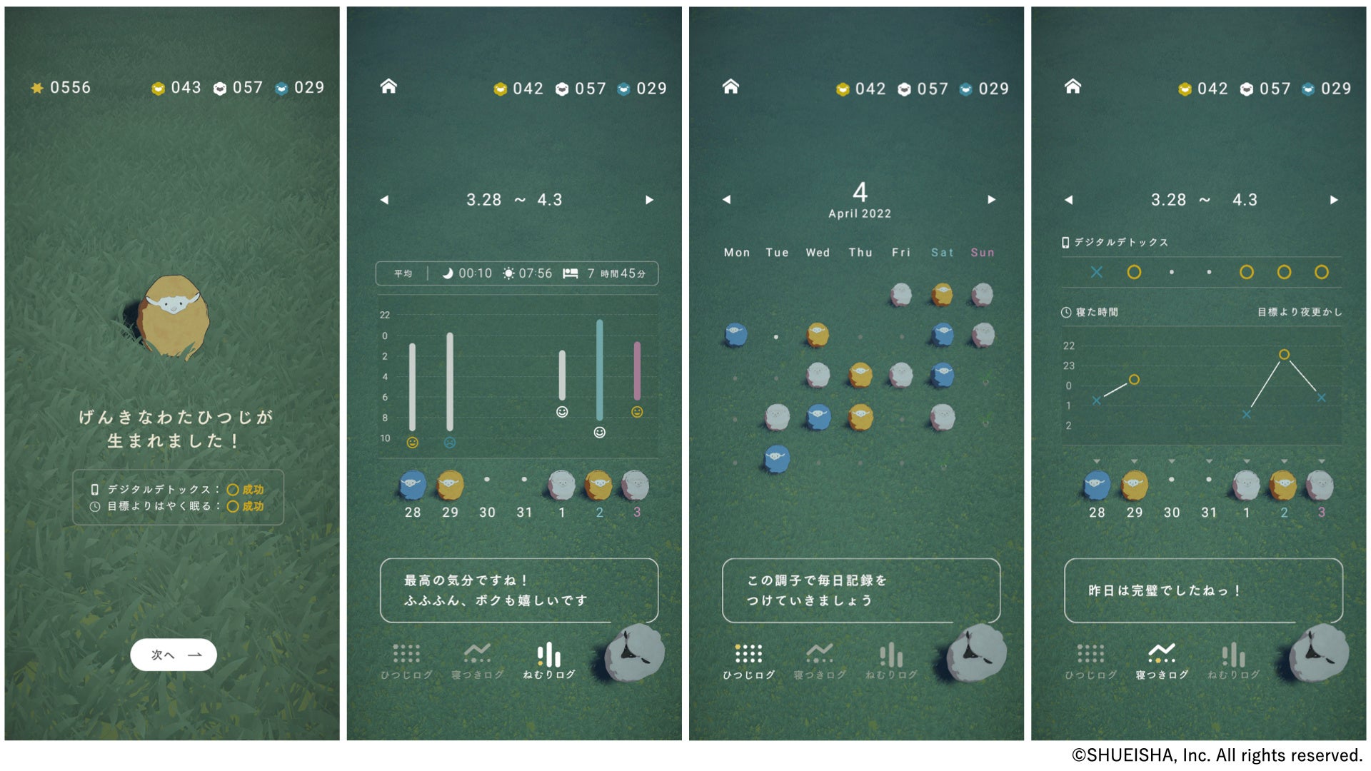 睡眠習慣を記録することで、朝起きるたびに、かわいらしいひつじが1匹、あなたの牧場に生まれます。牧場にいくと、あなたの睡眠記録をひつじたちが並んで教えてくれます。